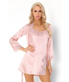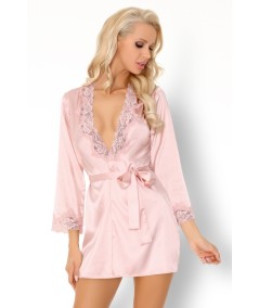 Niezwykle elegancki i kobiecy komplet bielizny z satyny w kolorze pudrowego różu. Koszulka na cienkich, regulowanych ramiączkach, której dekolt i rozcięcie z jednego boku ozdobiono misterną, jasnoróżową koronką. Przód i długie rękawy szlafroka wiązanego w talii paskiem, obszyte koronką. Długość kompletu sięga do połowy uda, w zestawie stringi.